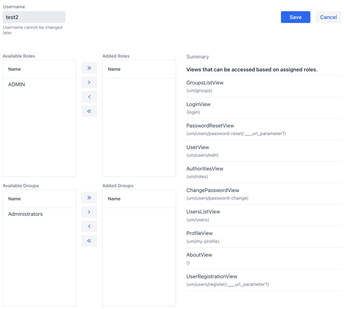 This component allows the selection of roles that will be assigned to the user being created. It shows the available roles in the system in the list that's on the left, and the selected roles for the user on the right. The buttons with symbols can be used to select and deselect the roles.