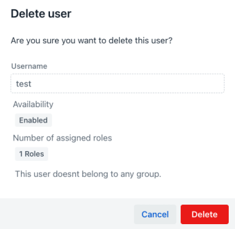 - Delete user: Displays a confirmation dialog with information of the current user (username, current status (availability), number of assigned roles and number of groups that the user belongs to), asking to confirm the deletion process. The deletion of the user is physical (will delete the user from the database).