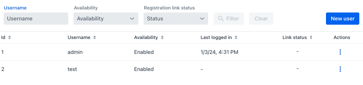 This view will display fields for filtering users by username, availability and registration link status (more information regarding this feature later).
