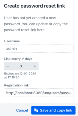 This dialog allows creating a password reset link that the user can use to reset the password, typically when the password is forgotten.